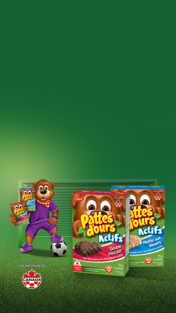 Goûtez la nouvelle gamme de Pattes d’ours Actifs offerte en deux nouvelles saveurs délicieuses telles que Muffin aux bleuets et Double chocolat. Ces biscuits moelleux sont sans arachides et emballés individuellement, ce qui les garde frais, tendres et moelleux dans les boîtes à lunch ou sur le pouce. Ils constituent la collation parfaite pour donner de l’énergie aux enfants actifs à tout moment!