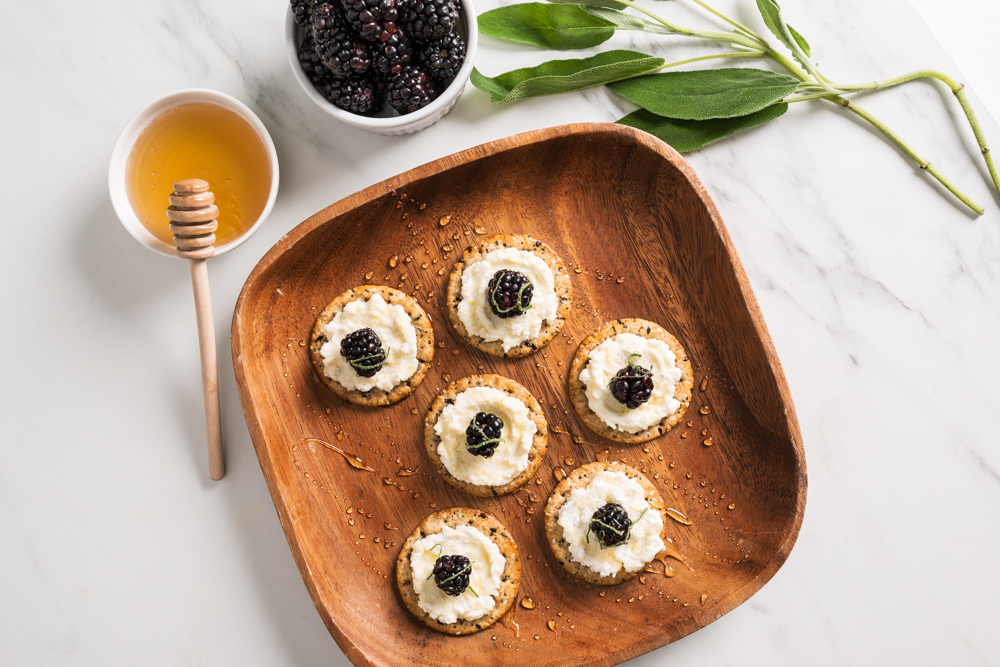 Spread with a lemony ricotta base, this sweet and savory cracker bite makes a perfect snack anytime.