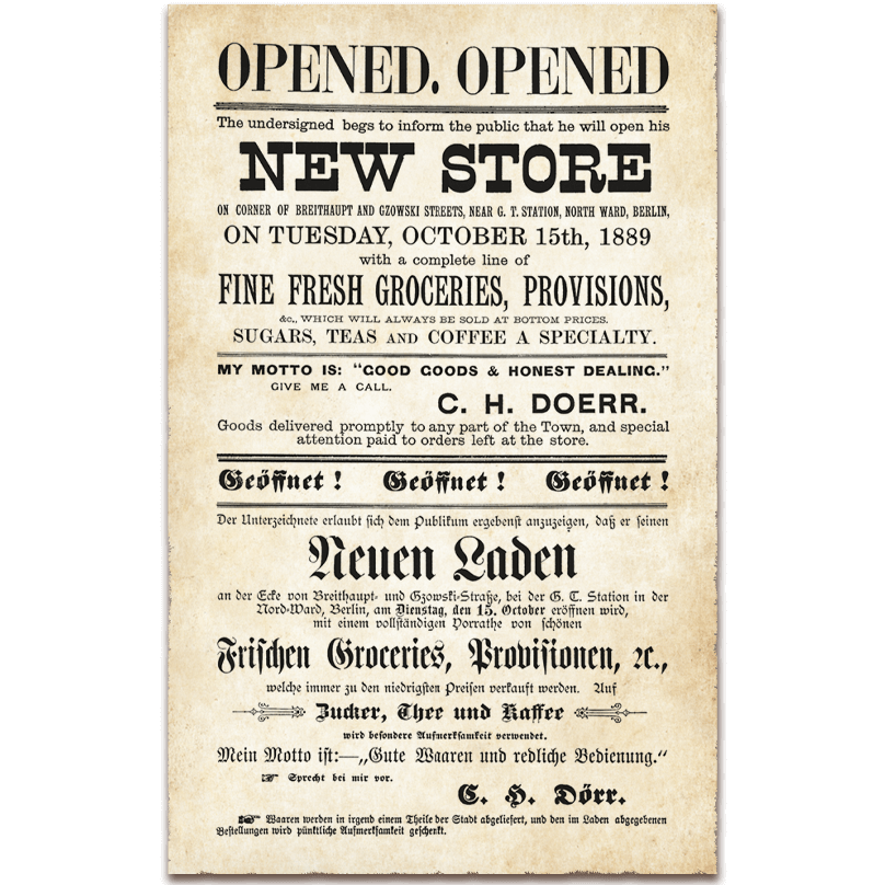 Charles H. Doerr begins a tradition of favourites by producing and selling cookies and candies from his small grocery store in Kitchener (then, Berlin), Ontario, Canada. Thanks to a strong commitment to the motto “good goods and honest dealing,” it’s not long before these quality products replace sales of general merchandise in the Doerr store.