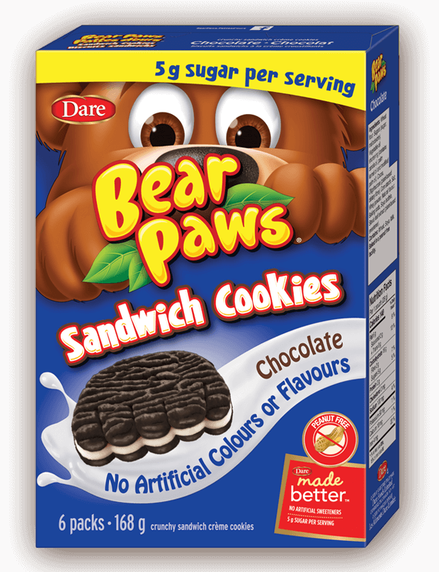 Canadians want healthier treats for their kids and Dare delivers by putting a new spin on a classic combination. We make our Bear Paws Sandwich Crème cookies better with 45% less sugar than the leading sandwich crème cookie.