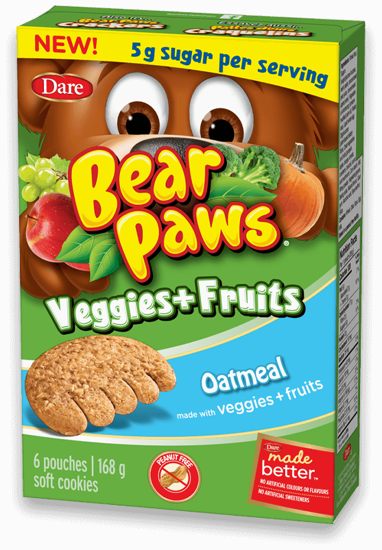 Dare packs more nutrients into Bear Paws Veggies + Fruits - the first soft Bear Paws cookies with real veggies + fruits baked right in!