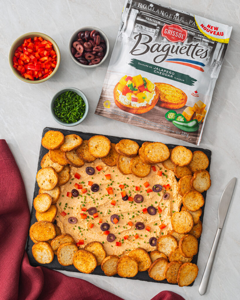 Cette version simple d’une tartinade de fromage classique de style Pub servie avec des Baguettes Boulangerie Grissol® Jalapeño Cheddar est une délicieuse façon de commencer n’importe quelle fête.