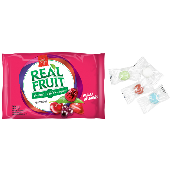 REALFRUIT Candy is plant-based (no animal gelatin), made with real fruit purées and no artificial colours or flavours. Available in portion pouches and caddy packs!