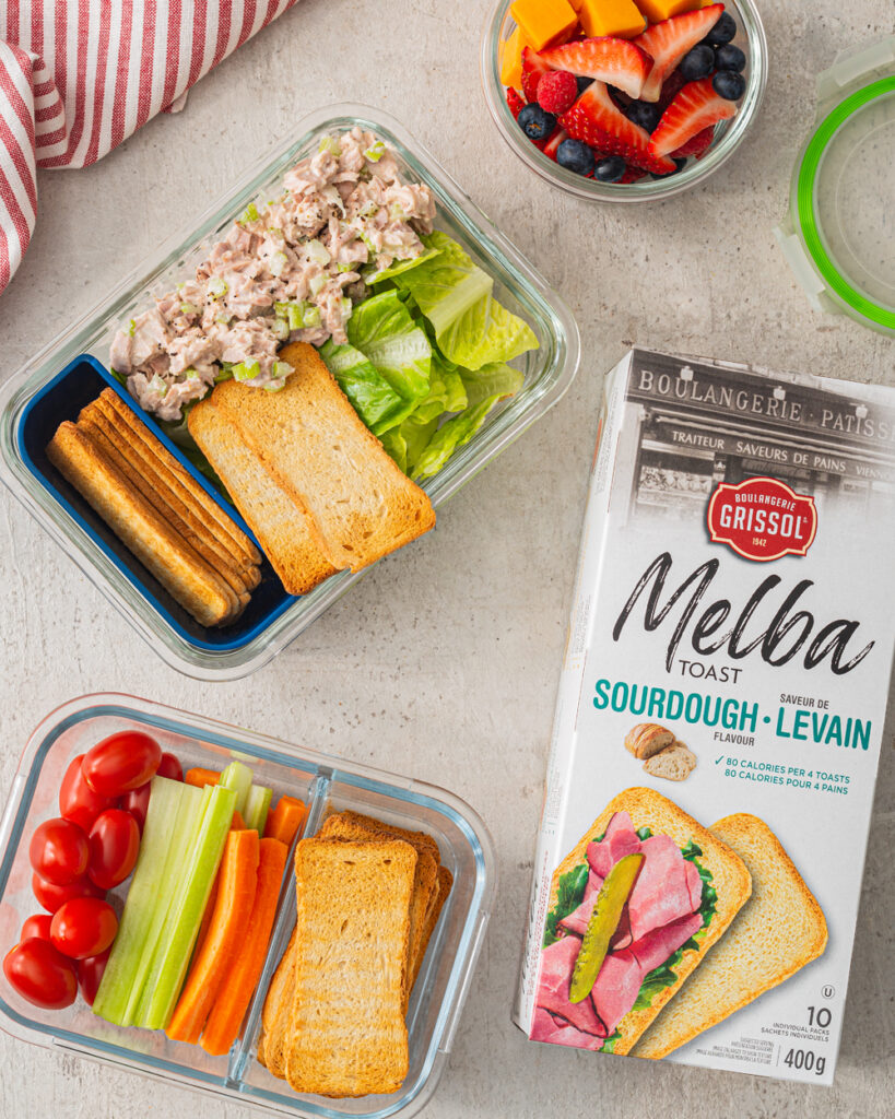 Simple et satisfaisante, cette idée de boite à lunch comprend des toasts, du thon, des fruits, des légumes et du fromage – parfaitement équilibrée pour l’école ou le travail.