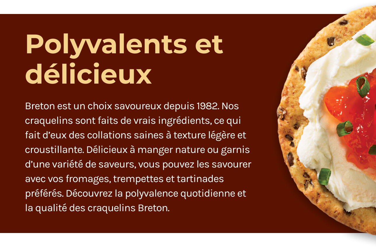 Breton offre une variété de délicieux craquelins polyvalents, qui regorgent de véritables bienfaits. Concoctez vos garnitures préférées et offrez-les avec Breton.