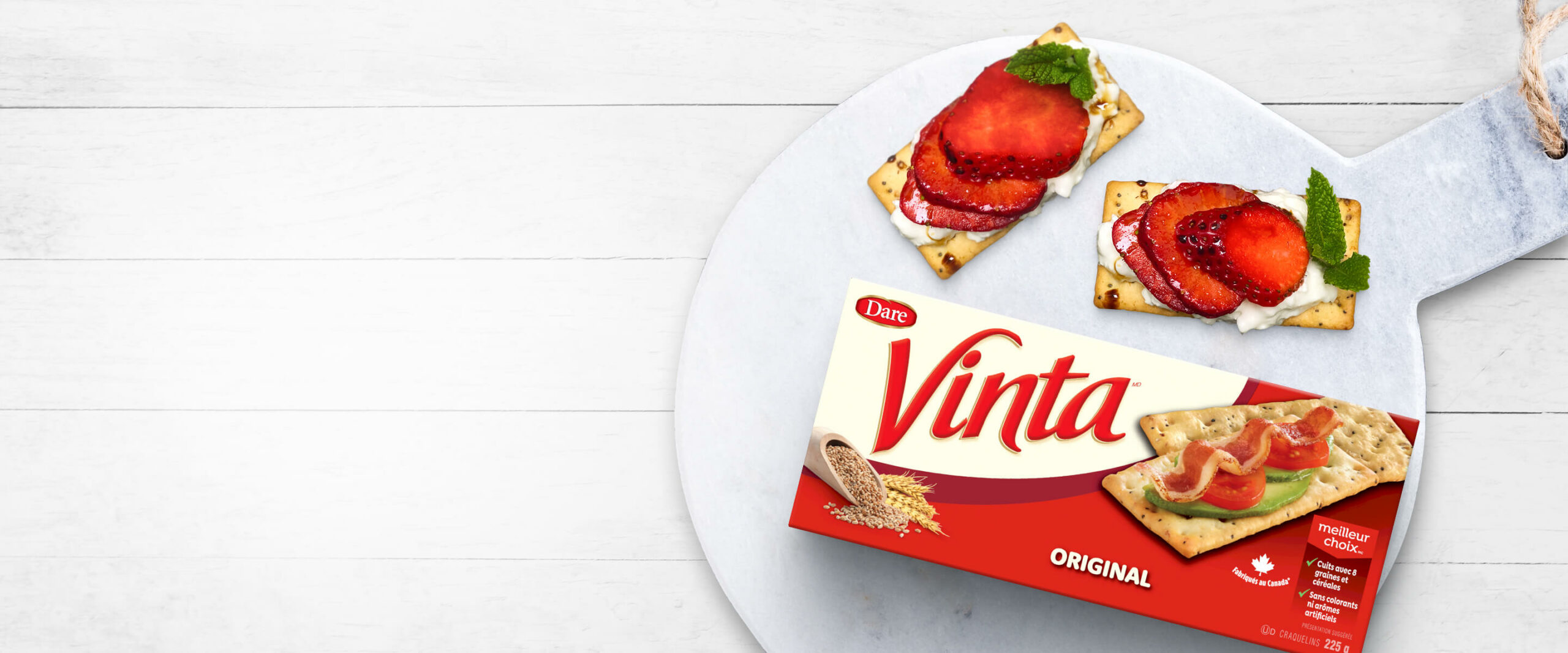 Découvrez tous les délicieux craquelins nourrissants de la gamme Vinta. Faits avec de vrais ingrédients authentiques tels que du romarin et des poivrons rouges grillés, ils vous offrent un meilleur choix.